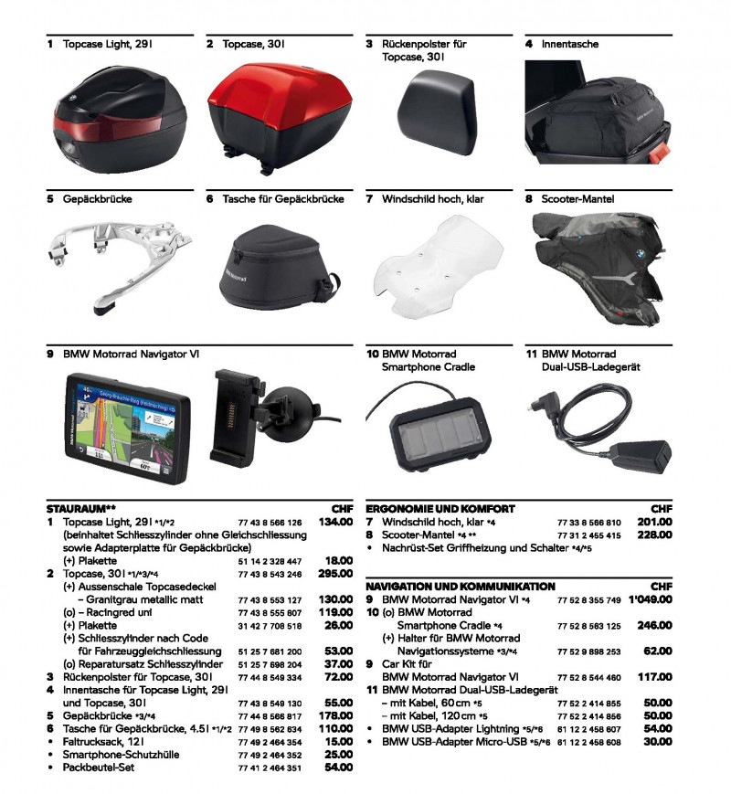 Topcase 30Liter in Fahrzeugfarbe lackiert, Rückepolster, Gepäckbrücke, Scooter-Mantel, 2 Fahrzeugschlüssel und Seitenständerauflage mit verstellbaren schwarzen Sportbremshebeln, Handschutz, Grosse und Kleine Scheibe