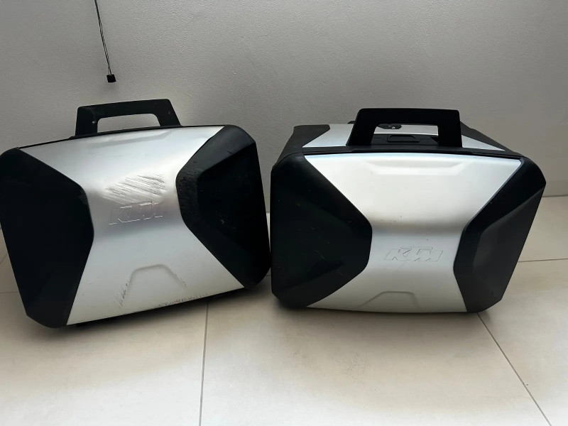 Ein Seitenkoffer ist zwar leicht verkratzt, aber voll funktionstüchtig. Die Kratzer stammen von einer meiner ersten Ausfahrten, da ich den Koffer nicht richtig befestigte, so dass ich ihn beim losfahren verlor.
