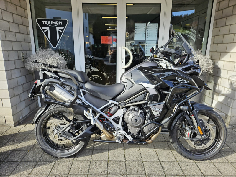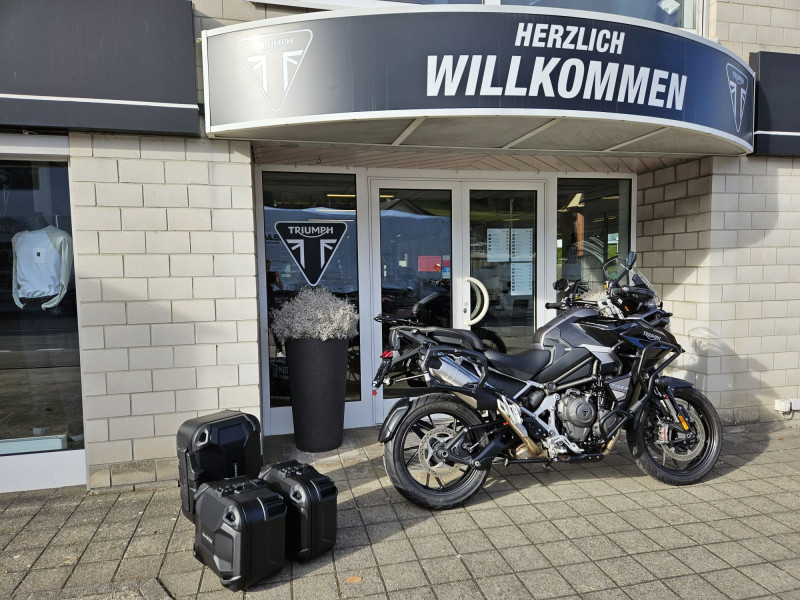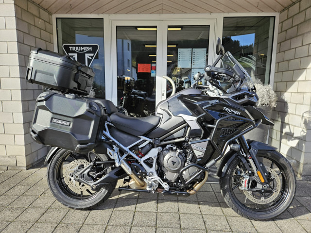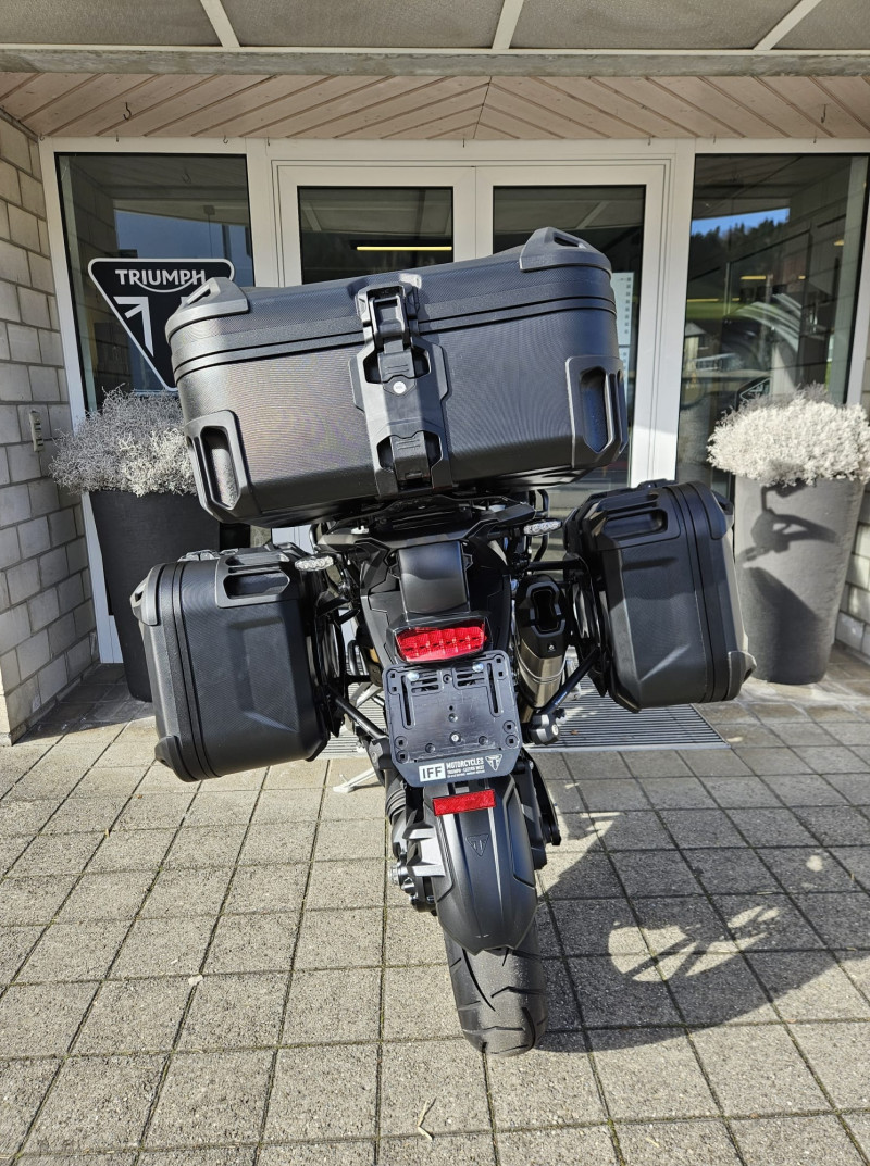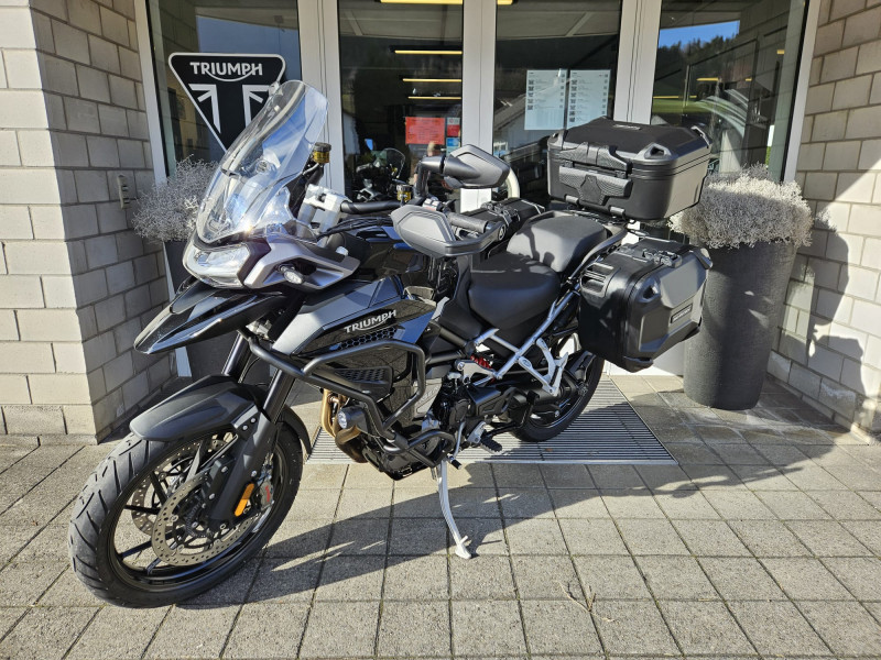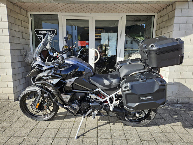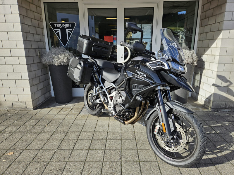 Die schöne Tiger 1200 GT Explorer ist ab Service und wird frisch vorgeführt. Sie ist mit schwarz pulverbeschichtetem Motor- & Tankschutzbügel, SW-Motech Seitenkoffern und Topbox, Lenkererhöhung sowie Schwingenschutz ausgestattet.