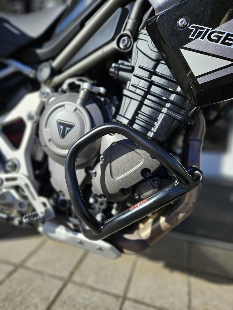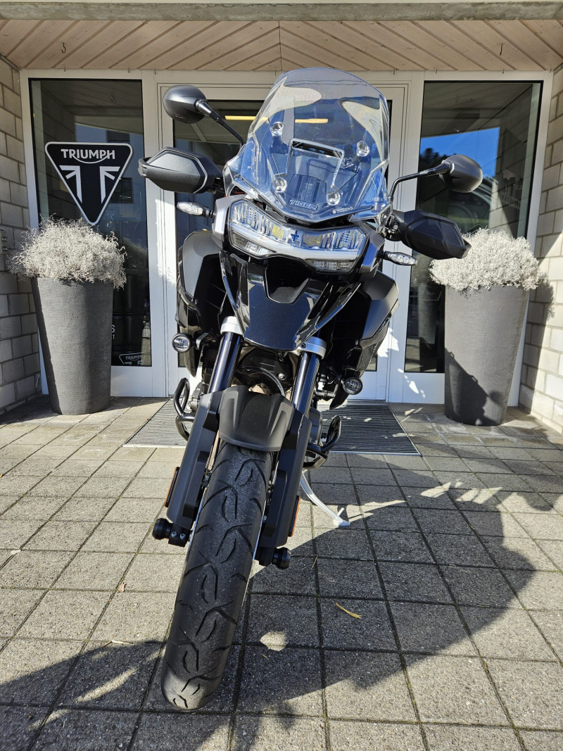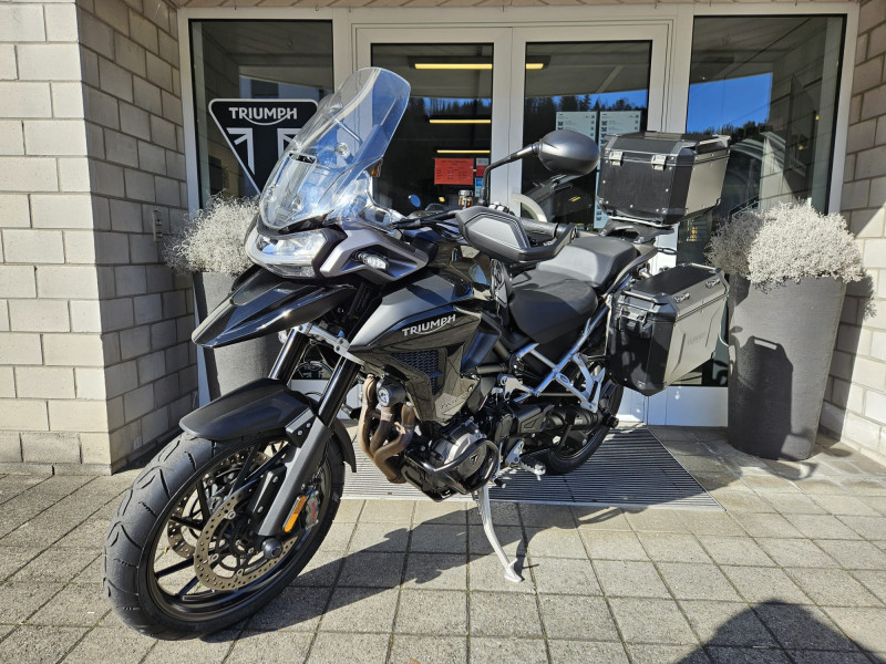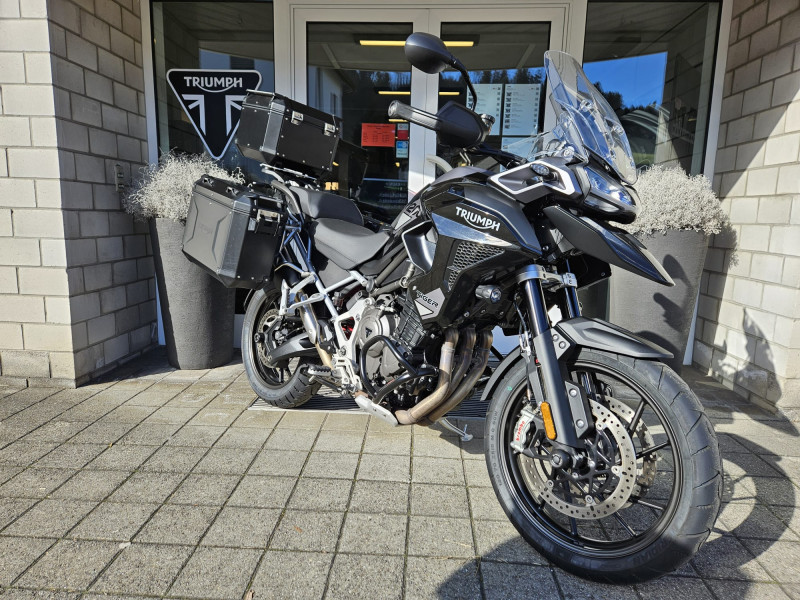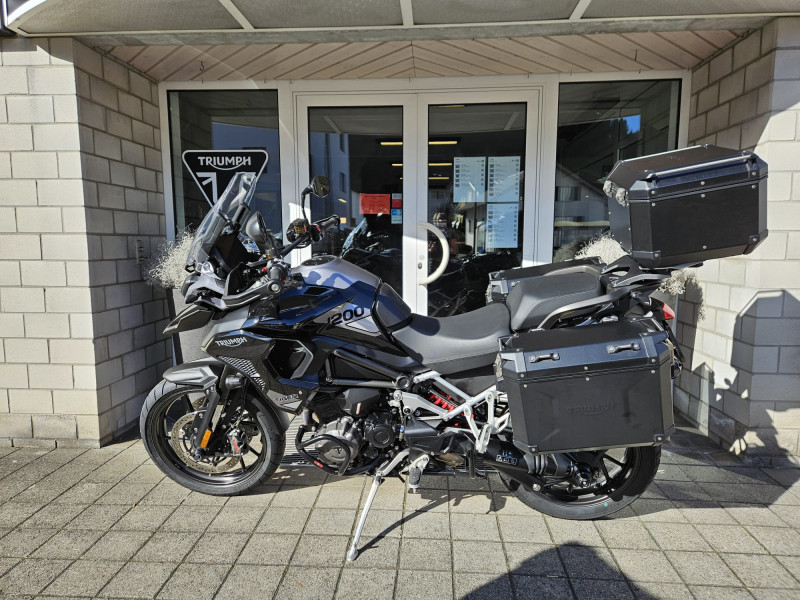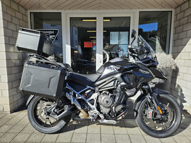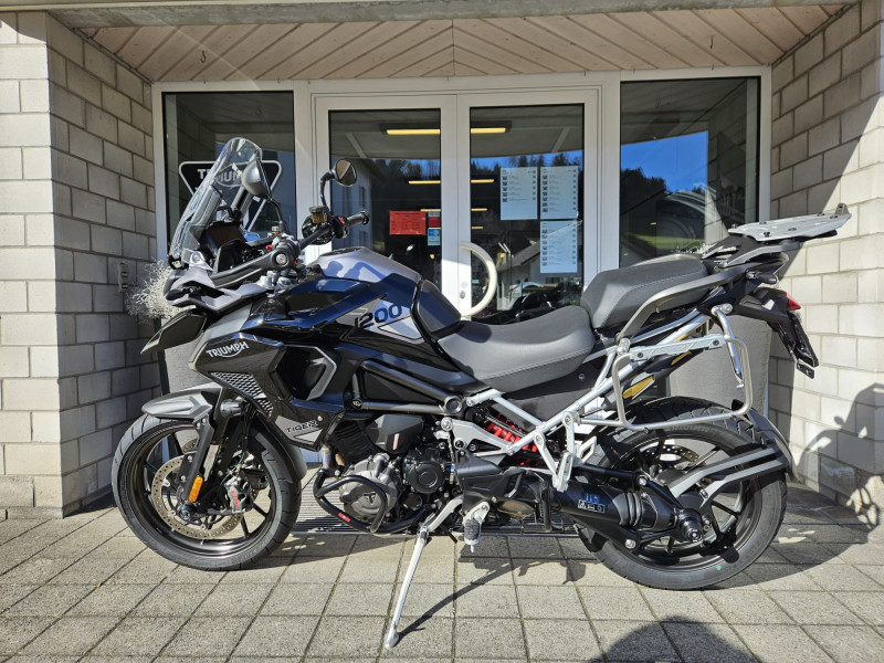 Die Tiger 1200 GT Pro, frisch ab Jahresservice ist mit originalem schwarzen Koffersatz inkl. Topbox, Achsenprotektoren und Motorschutzbügeln ausgestattet.
